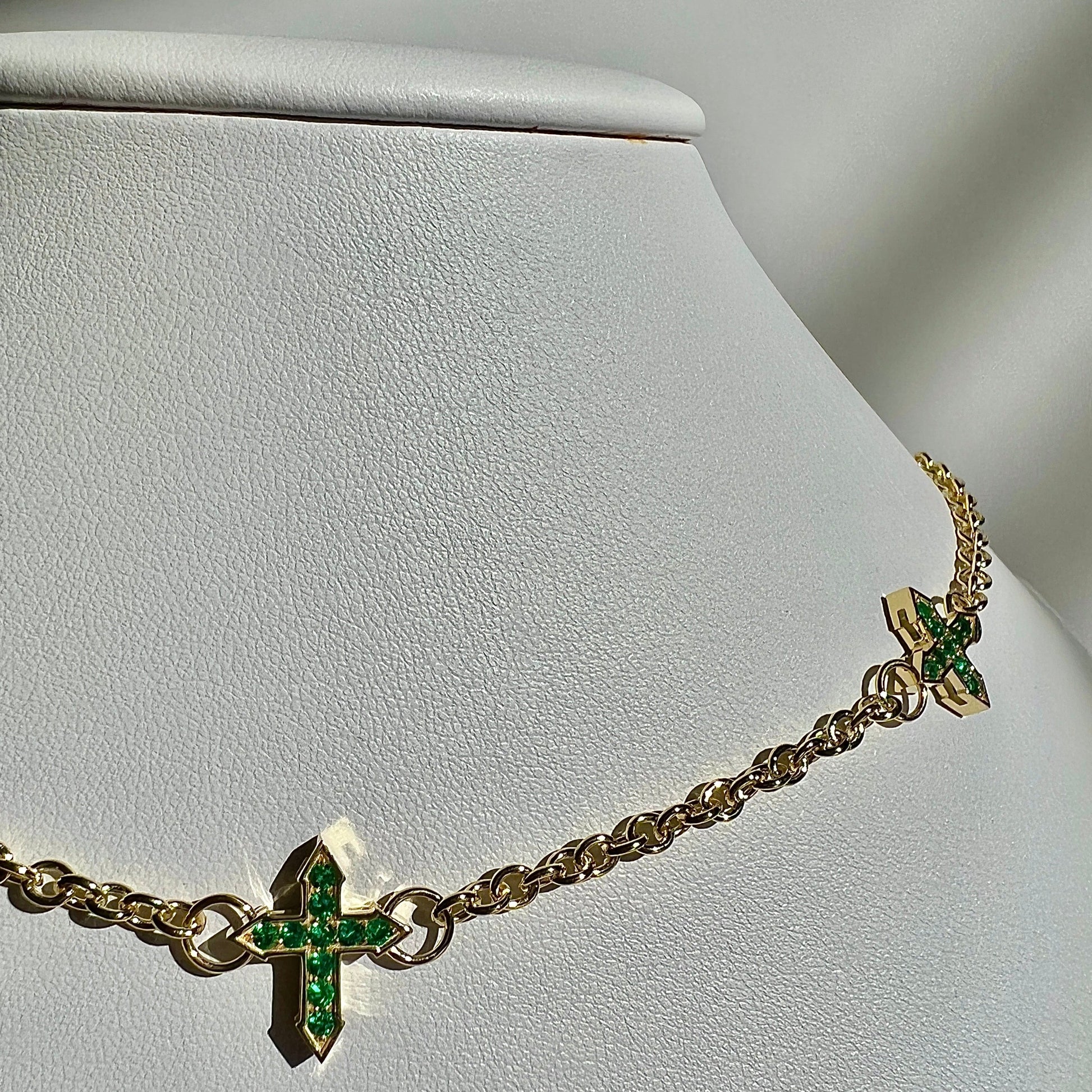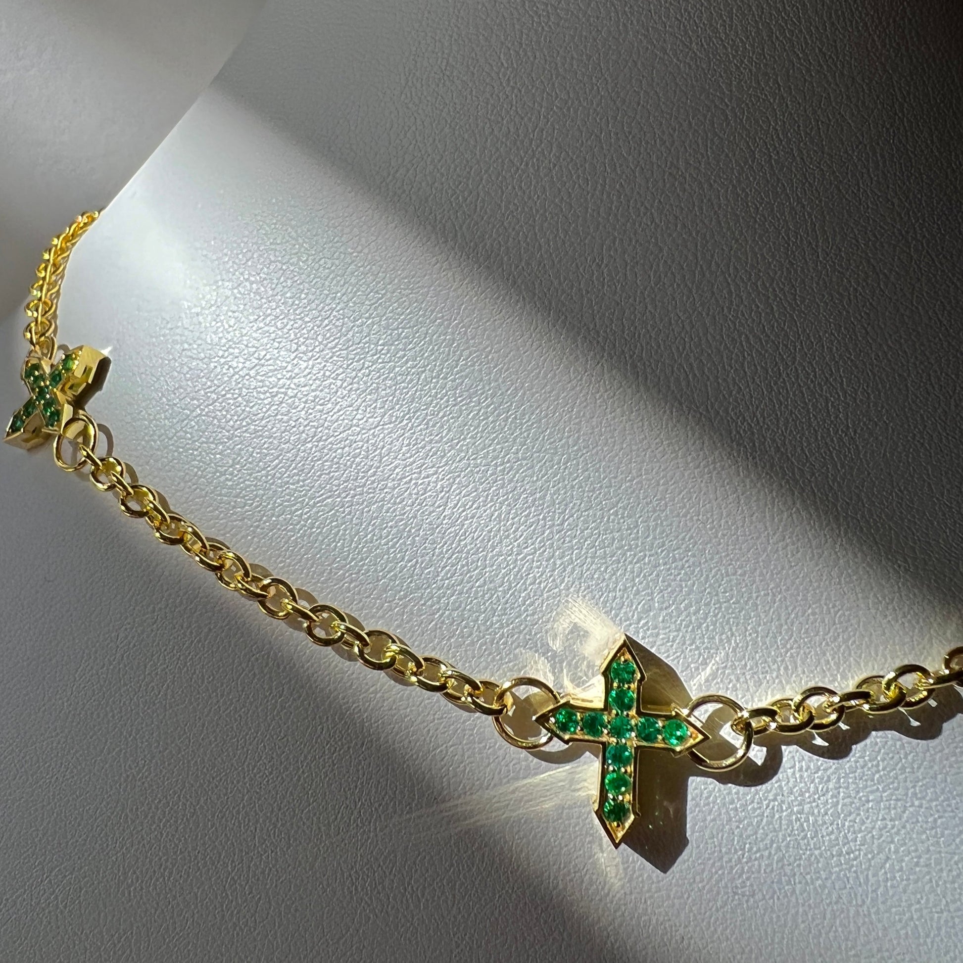 14K solid gold | emeralds: 56 round-cut stones (on both sides of the cross and stars), 1.75 mm each, ~ 1.2 ct total | length by choice